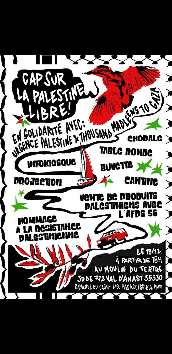 Dans le cadre de la tournée bretonne de solidarité internationaliste, « Cap sur la Palestine libre » du 10 au 18 décembre 2025, retrouvons-nous pour la dernière étape au Moulin du Tertre le 18 décembre à partir de 18H. Ce lundi 17 novembre, le conseil de sécurité des Nations Unies adopte une résolution: désarmement de toutes les […]